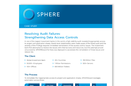 In one of the largest investment banks in the world, a high visibility audit revealed inappropriate access to project and application shares. Board-level stakeholders were made aware of the failed audit and the severity of the findings required immediate remediation of the access control issues.