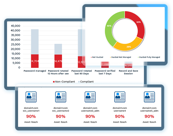 See which privileged accounts are unvaulted, noncompliant, or misaligned with policy—plus insights into protection gaps, password rotation, and